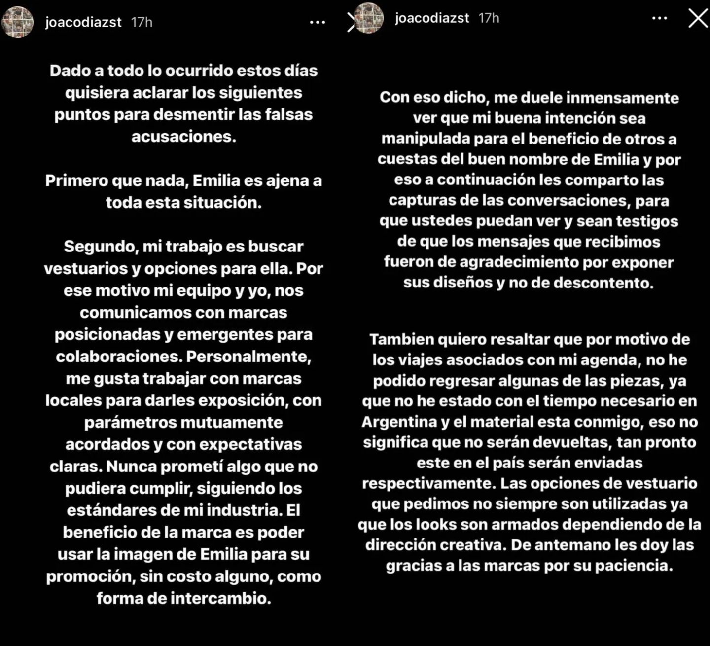«Mi trabajo es buscar vestuarios y opciones para ella. Mi equipo y yo nos comunicamos con marcas posicionadas y emergentes para colaboraciones. Nunca prometà algo que no pudiera cumplir. El beneficio de la marca es poder usar la imagen de Emlia para su promoción, sin costo alguno, como forma de intercambio«, aclaró porque varias marcas de emprendedores reclamaron justamente el no haber sido etiquetados en los posteos que Emilia usa la ropa.