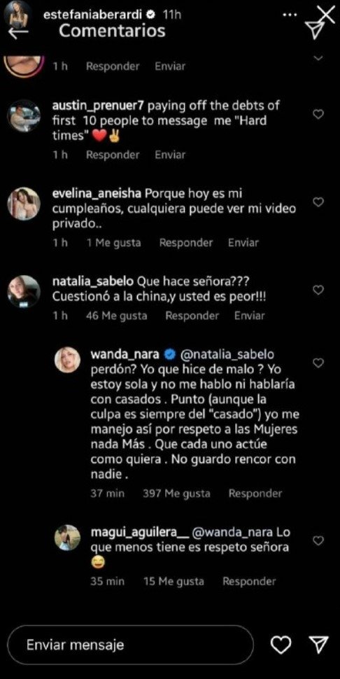 «¿Perdón? ¿Yo qué hice de malo? Yo estoy sola y no me hablo ni hablaría con casados. Punto. Aunque la culpa es siempre del casado, yo me manejo así por respeto a las mujeres, nada más.. . Que cada uno actúe como quiera. No guardo rencor con nadie«, contestó Wanda Nara para dejar en claro que su actitud no es la misma que tuvo la China Suarez.