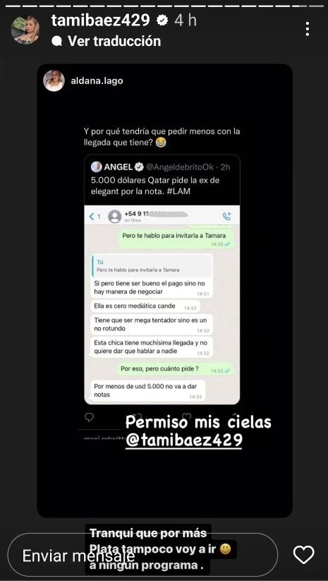 Tamara Báez se volvió noticia luego de que Ángel de Brito revelará un chat, en donde supuestamente el representante de la ex pareja de L-Gante pide como mínimo 5 mil dólares para brindar una nota.