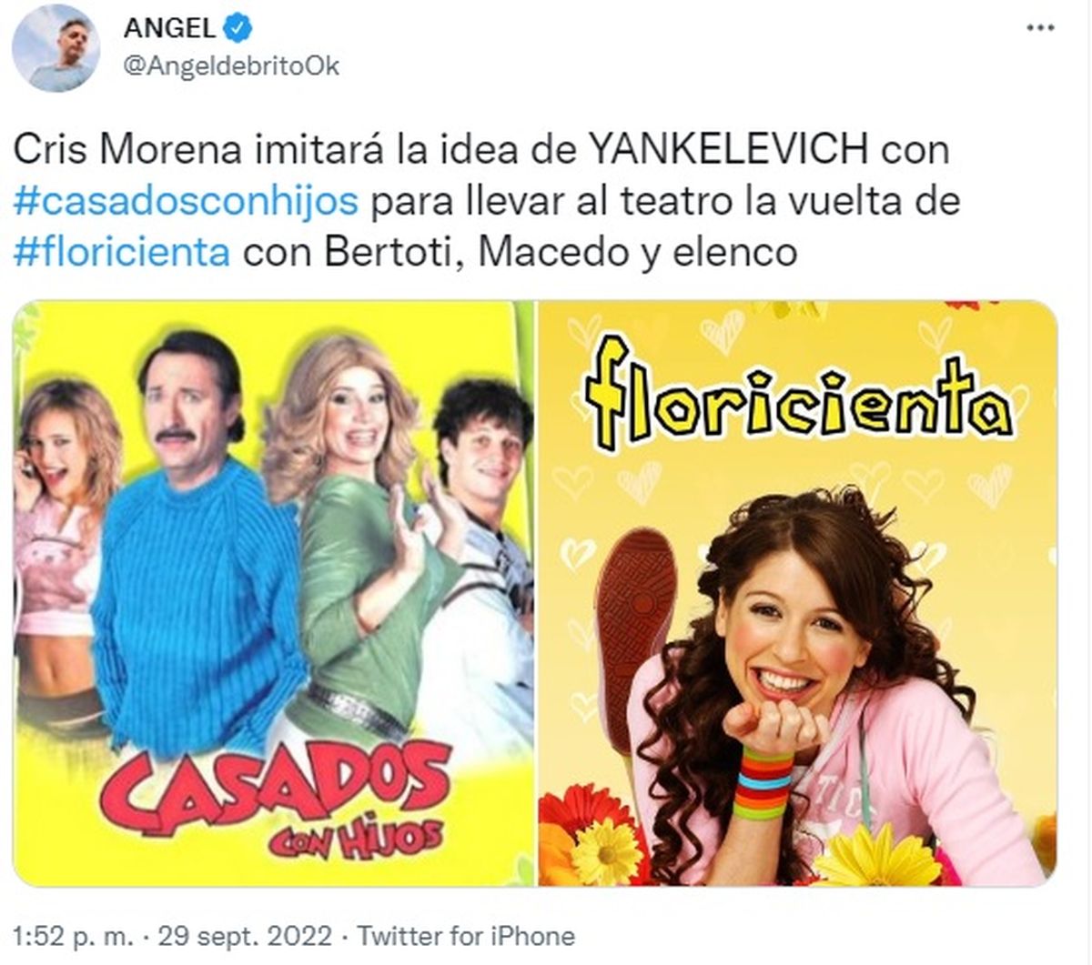 “Cris Morena imitará la idea de Yankelevich con Casados con Hijos para llevar al teatro la vuelta de Floricienta”, escribió el periodista en su cuenta de Twitter.