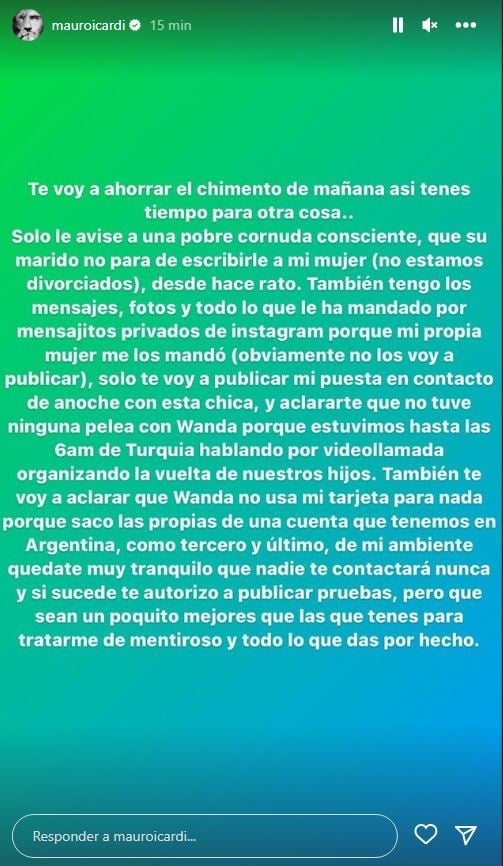 “(…) También tengo los mensajes, fotos y todo lo que le ha mandado por mensajitos privados de Instagram porque mi propia mujer me los mandó (obviamente no los voy a publicar) solo te voy a publicar mi puesta en contacto de anoche con esta chica, y aclararte que no tuve ninguna pelea con Wanda porque estuvimos hasta las 6 am de Turquía hablando por videollamada organizando la vuelta de nuestros hijos”, escribió el jugador.