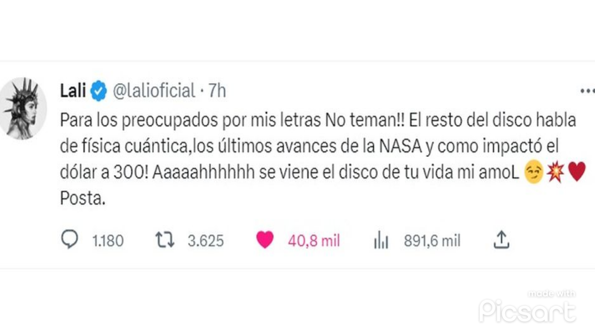 «Para los preocupados por mis letras No teman!! El resto del disco habla de física cuántica, los últimos avances de la NASA y como impactó el dólar a 300! Aaaaahhhhhh se viene el disco de tu vida mi amol. Posta«, escribió la artista.