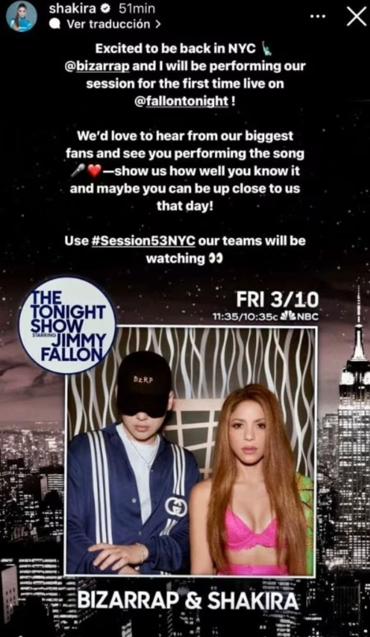 “Emocionada de regresar a Nueva York con Bizarrap y estaré presentando nuestra sesión por primera vez en vivo con Jimmy Fallon… Nos encantaría saber de nuestros mayores fans y verlos interpretando la canción. Muéstrenos qué tan bien lo saben y tal vez puedan estar cerca de nosotros ese día”, escribió la artista.
