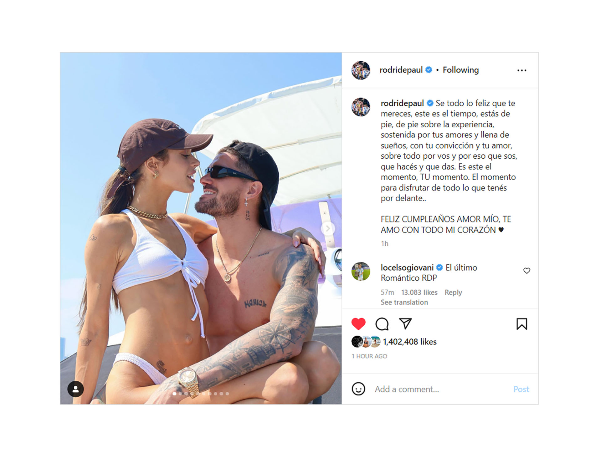 «Sé todo lo feliz que te mereces, este es el tiempo, estás de pie, de pie sobre la experiencia, sostenida por tus amores y llena de sueños, con tu convicción y tu amor, sobre todo por vos y por eso que sos, que hacés y que das. Es este el momento. TU momento. El momento para disfrutar de todo lo que tenes por delante» escribió Rodrigo De Paul en su cuenta de Instagram.