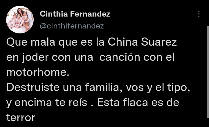 En un encendido posteo en su cuenta de Twitter, Fernández expresó su enojo hacia la China Suárez:»¡Qué mala que es la China Suárez en joder con una canción en el motorhome! Destruiste una familia, vos y el tipo, y encima te reís. Esta flaca es de terror«.