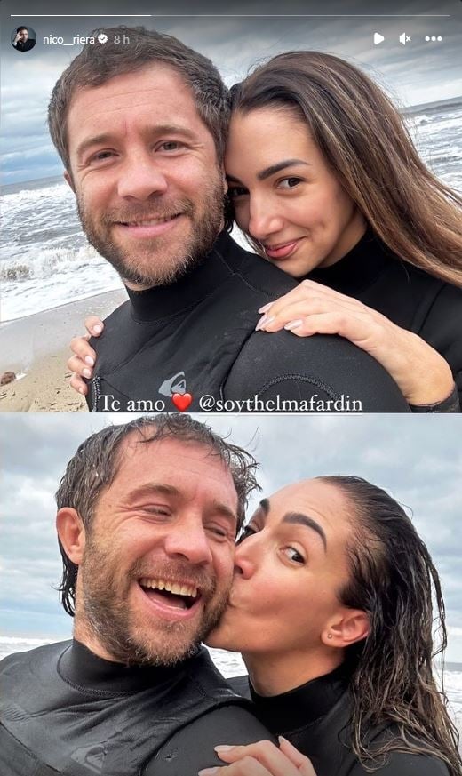 El actor compartió una foto en su storie de Instangram, en donde se lo puede ver sonriendo a la cámara, mientras Thelma Fardin lo abraza desde atrás con una mirada cómplice.