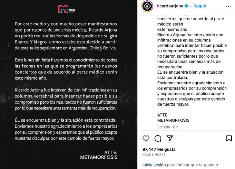 En el comunicado que subió la productora, se puede leer lo siguiente: «Por este medio y con mucho pesar manifestamos que por razones de una crisis médica, Ricardo Arjona no podrá realizar las fechas de despedida de su gira Blanco y negro (…)«