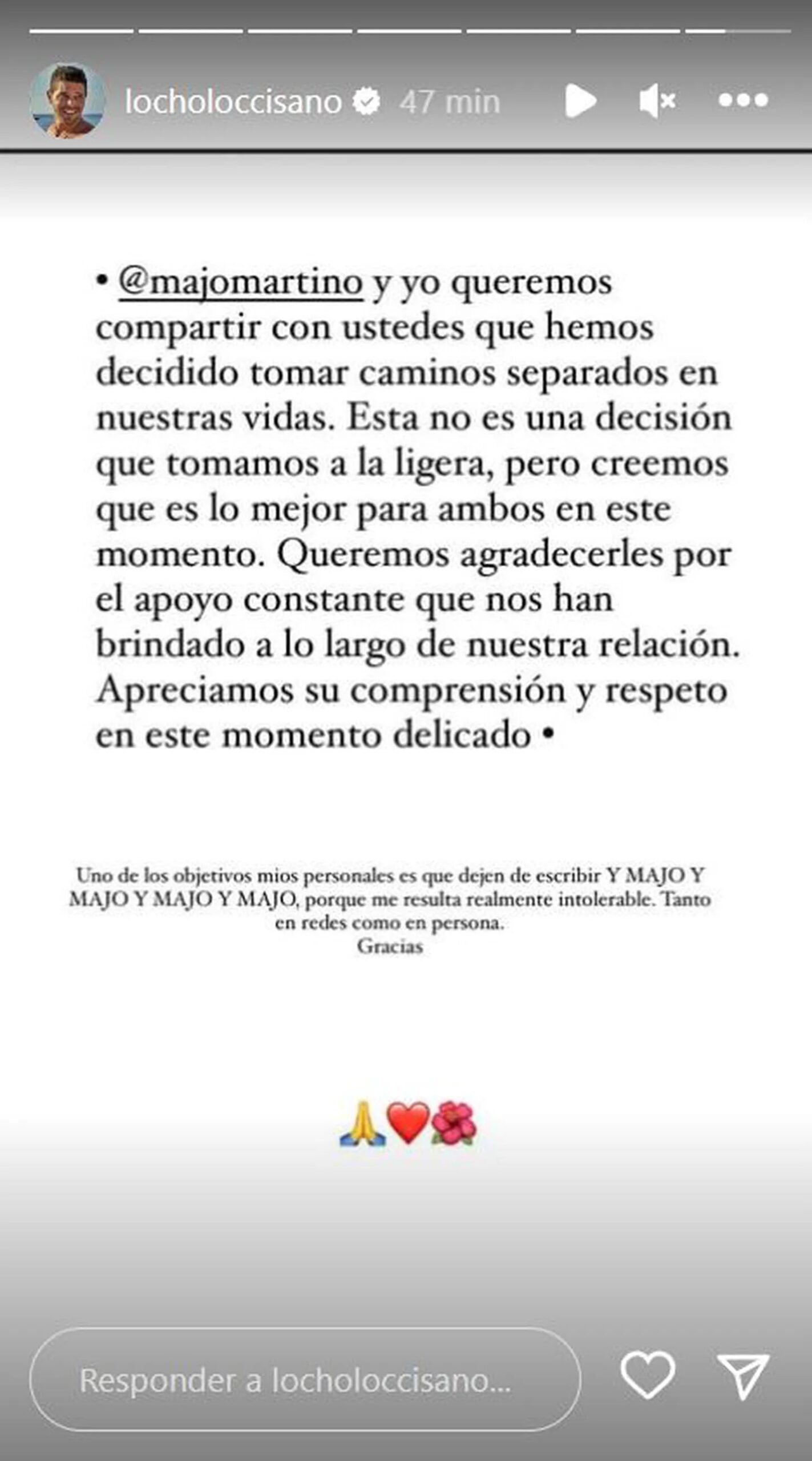 Majo y yo queremos compartir con ustedes que hemos decidido tomar caminos separados en nuestras vidas. Esta no es una decisión que tomamos a la ligera, pero creemos que es lo mejor para ambos en este momento”, se lee al principio.