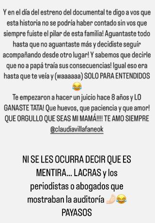Y cerró, arrobando a su mamá: “¡Te empezaron a hacer un juicio hace ocho años y lo ganaste, Tata! ¡Qué huevos, qué paciencia y qué amor! ¡¡¡Qué orgullo que seas mi mamá!!!! Te amo siempre. Ni se les ocurra decir que es mentira… Lacras. Y los periodistas o abogados que mostraban la auditoría, payasos”.