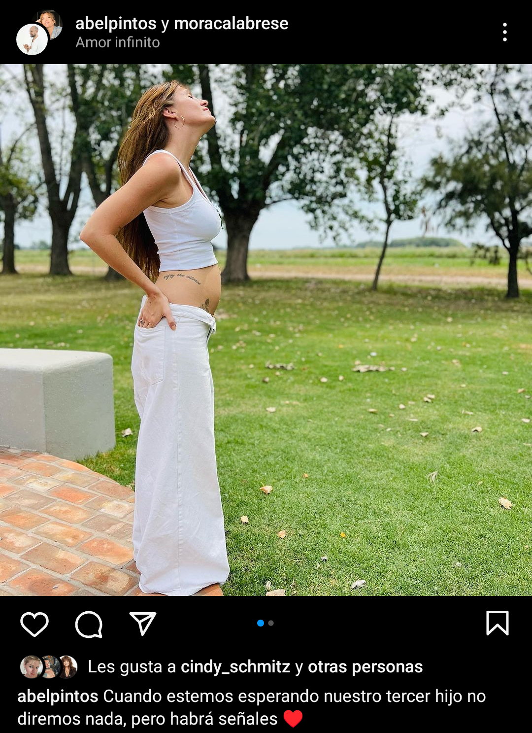 Abel compartió una imagen de su esposa, Mora Calabrese, con una pequeña pancita. También hay otra foto de los dos juntos, en donde el cantante la está abrazando con amor por detrás.