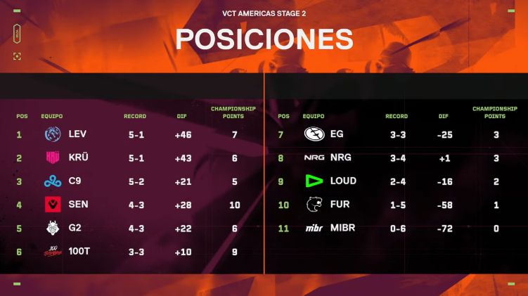 Ya arrancó la emoción del VCT Americas Stage 2, en el enfrentamiento inaugural la escuadra de Leviatán se llevó su primera victoria contra MIBR, mientras que Sentinels, Furia, Evil Geniuses y G2 también se llevaron victorias en esta primera semana del torneo, te compartimos las posiciones de los equipos: