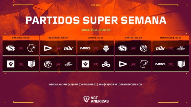 Vive todos los enfrentamientos de tus equipos favoritos en esta Súper Semana en los canales de transmisión oficiales de Twitch y Youtube. El #VCTAmericas se encuentra en todas las redes sociales: X, Instagram y TikTok, síguelas para conocer todas las novedades dentro de los esports en VALORANT.