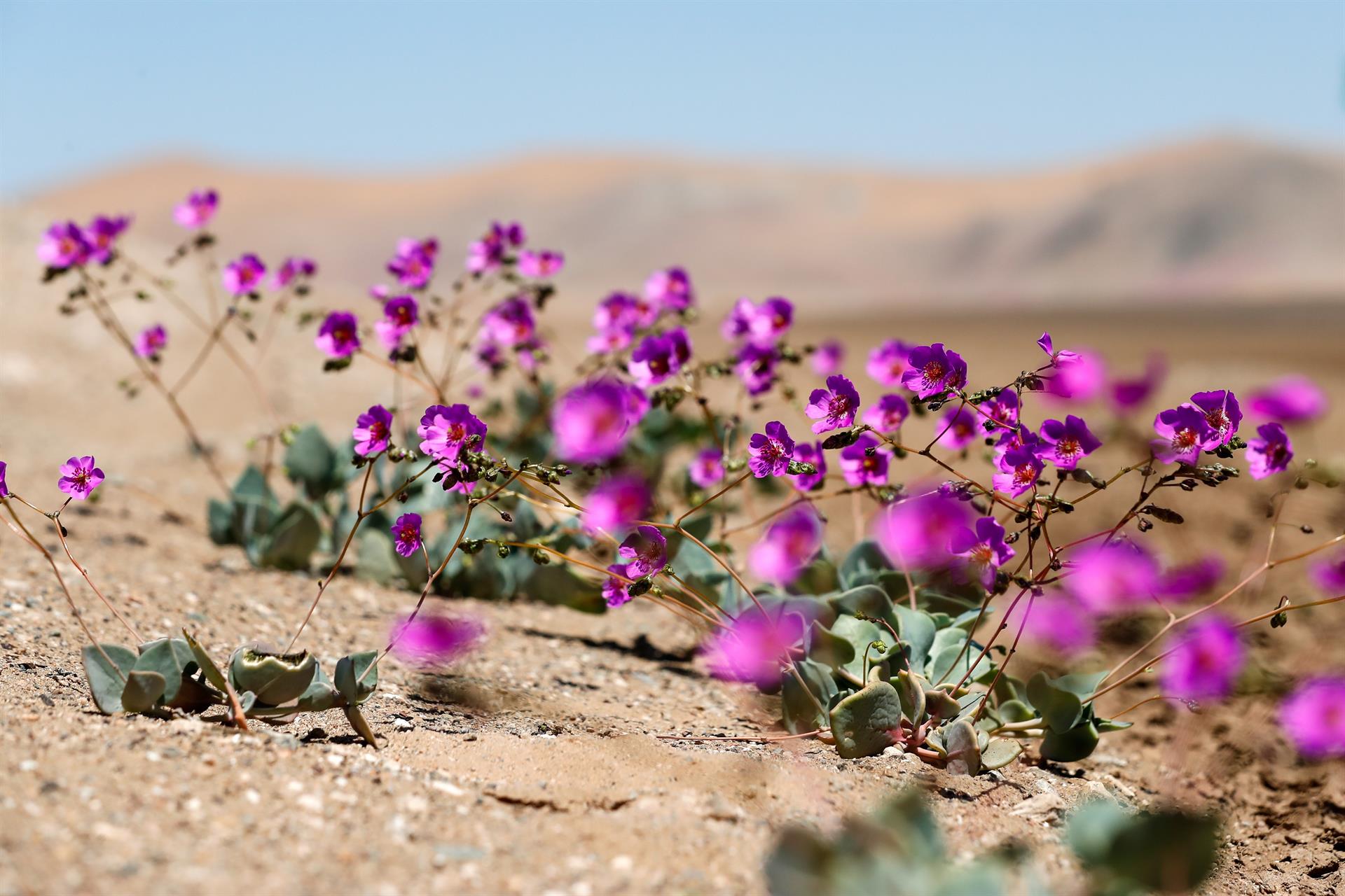 Entre las flores que han brotado, la principal protagonista ha sido la «pata de guanaco», una flor de color morado que solo requiere agua y prefiere los sitios arenosos. Esta especie ha encontrado en las condiciones climáticas actuales el ambiente perfecto para florecer y cubrir el desierto de un manto multicolor.