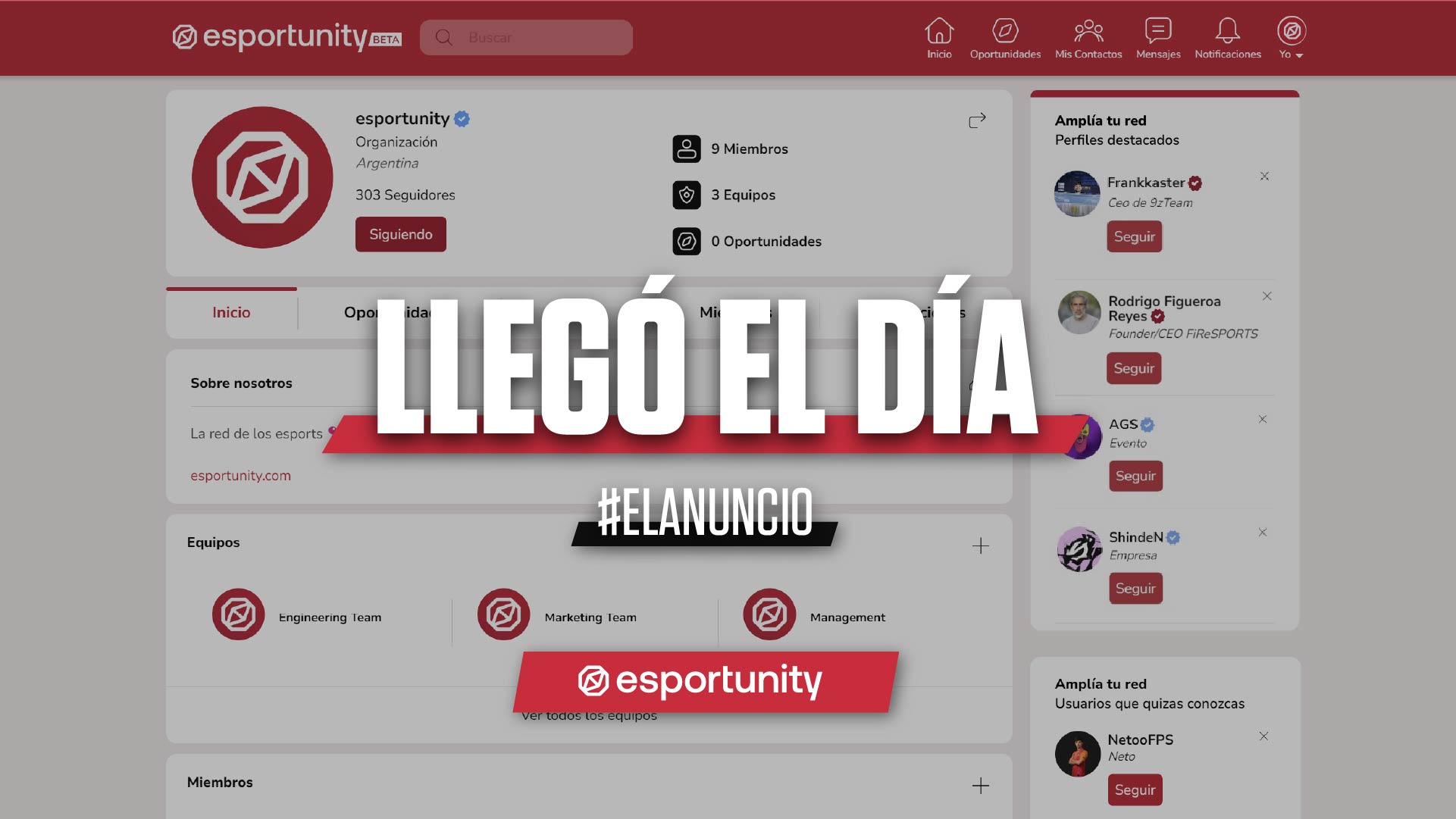 Esportunity nace como respuesta a la necesidad de tener un espacio que nos conecte a todos los que formamos parte de la industria de los esports y el gaming. Así nació la plataforma que permite compartir contenido social y profesional, crear oportunidades y potenciar el crecimiento de la escena.