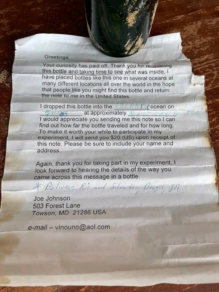 “Su curiosidad dio sus frutos. Gracias por recuperar esta botella y tomarse el tiempo de revisar su contenido. Lancé botellas similares en diferentes océanos con la esperanza de que alguien como usted las descubra y me devuelva la nota a EE.UU.”, decía la carta escrita por Joe.
