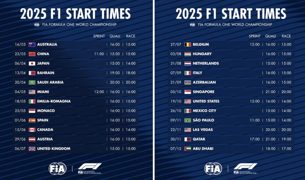 La Fórmula 1 ya tiene todo listo para comenzar su calendario 2025, que iniciará en Melbourne con el Gran Premio de Australia. La Federación Internacional del Automóvil (FIA) publicó los horarios de cada una de las fechas, que se extenderán hasta diciembre, cuando el campeonato cierre en Abu Dhabi.