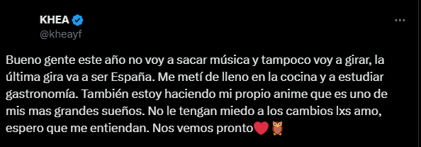 El 11 de marzo Khea sorprendió a sus seguidores al anunciar en su cuenta X que se va a retirará temporalmente de la música.